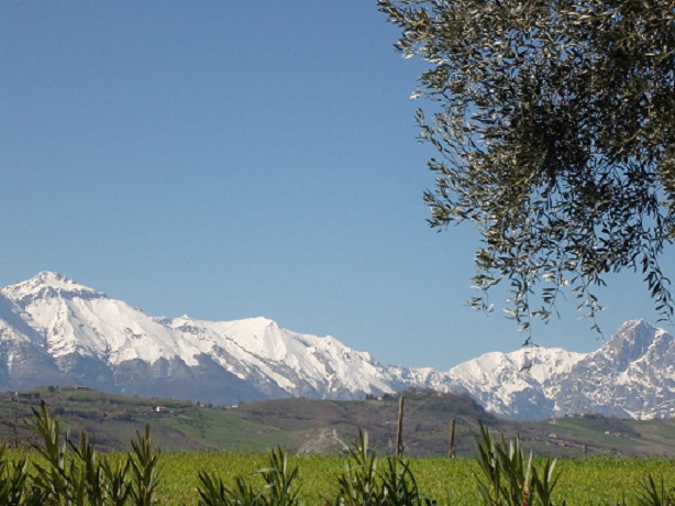 There is a panoramic view of the rolling Abruzzo countryside extending from the sea in the east to the mountains in the west.